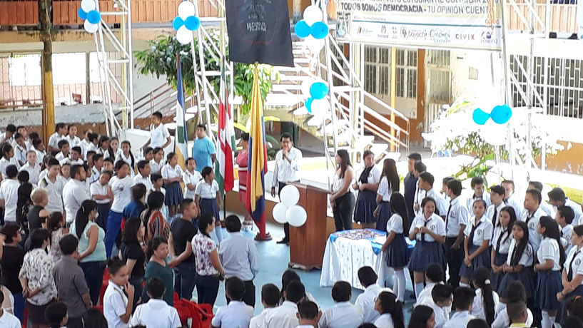 El evento tuvo como característica principal una distribución poco común en la institución, colocando el estrado en la parte lateral de la cancha, ubicando algunos estudiantes en la parte superior dejando así espacio suficiente para las sillas donde se ubican los profesores, al no estar los profesores en la disciplina de cada uno de los grados, esta labor fue dirigida por algunos estudiantes de grado once, esta distribución dio como resultado una gran cantidad de estudiantes atentos a las actividades realizadas.